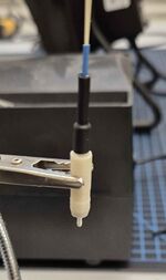 Zunächst muss der Drucksensor in den Kern eingeklebt werden. Verwendet wurde hierfür LOCTITE® EA 9480. Der Klebstoff wurde um den kompletten Umfang des Drucksensors aufgetragen und anschließend in den Kern eingeführt. Anschließend wurde der Drucksensor am Kabel um 360° gedreht um sicherzustellen, dass der Klebstoff überall und gleichmäßig verteilt ist. Der Kleber soll nun über Nacht aushärten. Als nächster Fertigungsschritt, muss der Drucksensor mit der DMS Verstärkerplatine verlötet und der Nullpunktausgleich durchgeführt werden. Dieser Schritt wird von LbA Rohnen durchgeführt werden.